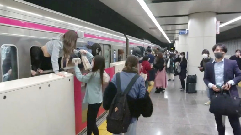 Σε άλλο βίντεο, έντρομοι οι επιβάτες βγαίνουν από τα παράθυρα του τρένου της γραμμής Κεϊό, το οποίο ακινητοποιήθηκε σε έναν σταθμό, στα δυτικά προάστια της ιαπωνικής πρωτεύουσας.